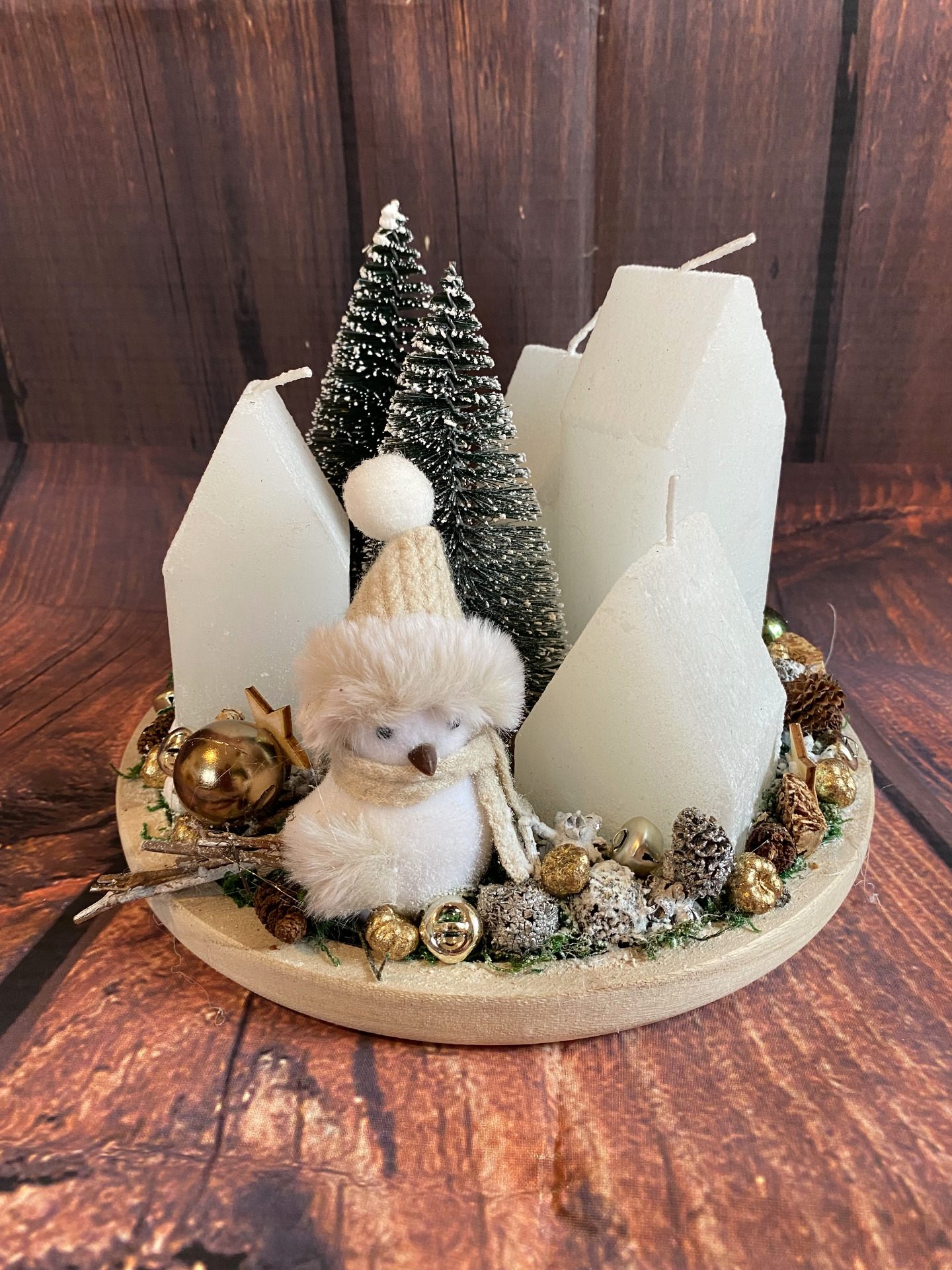 Neobvyklý adventní svícen potěší nejen děti, zdobený je ptáčkem, stromky a dominují mu netradiční svíčky ve tvaru domečků. Průměr cca 25 cm.