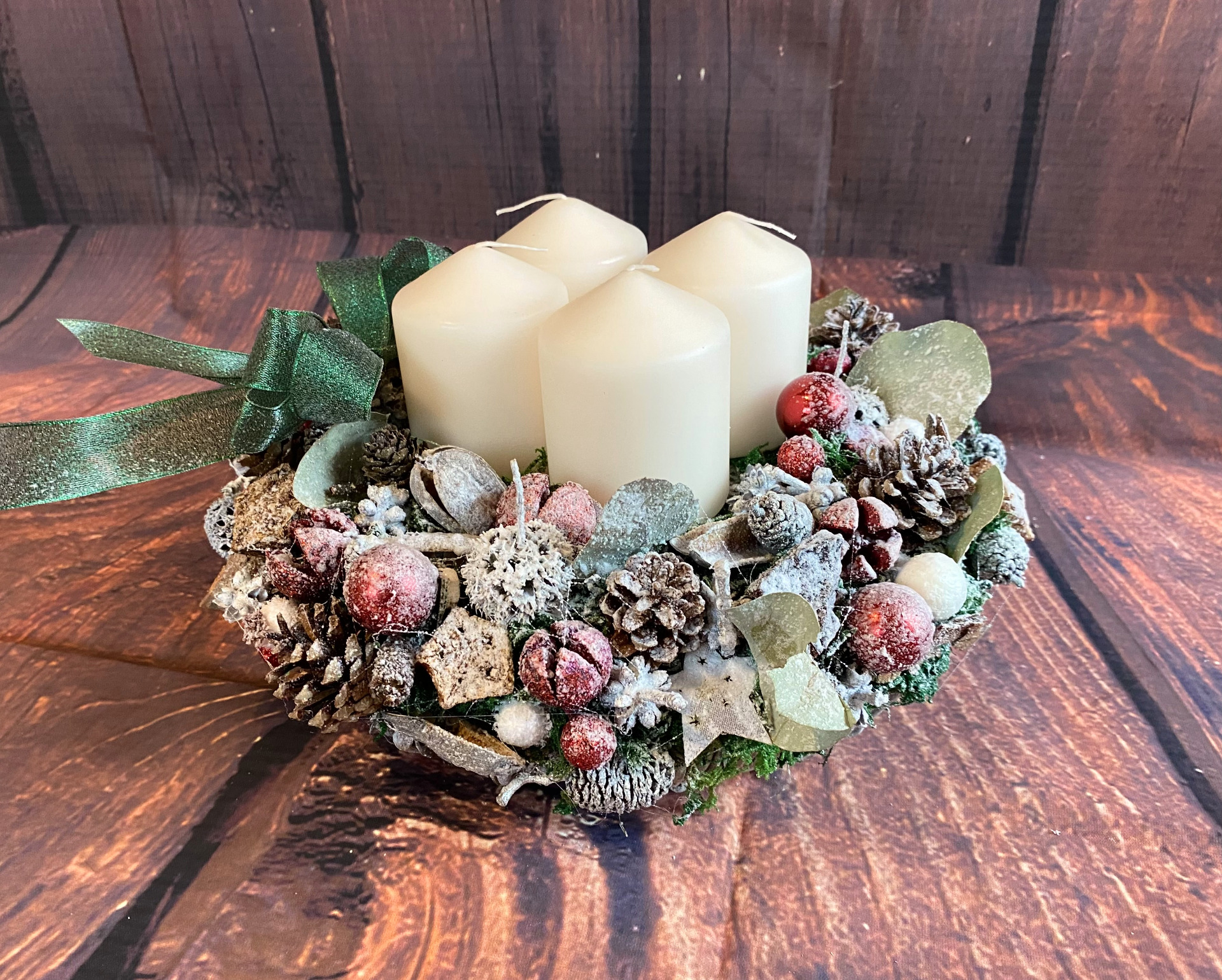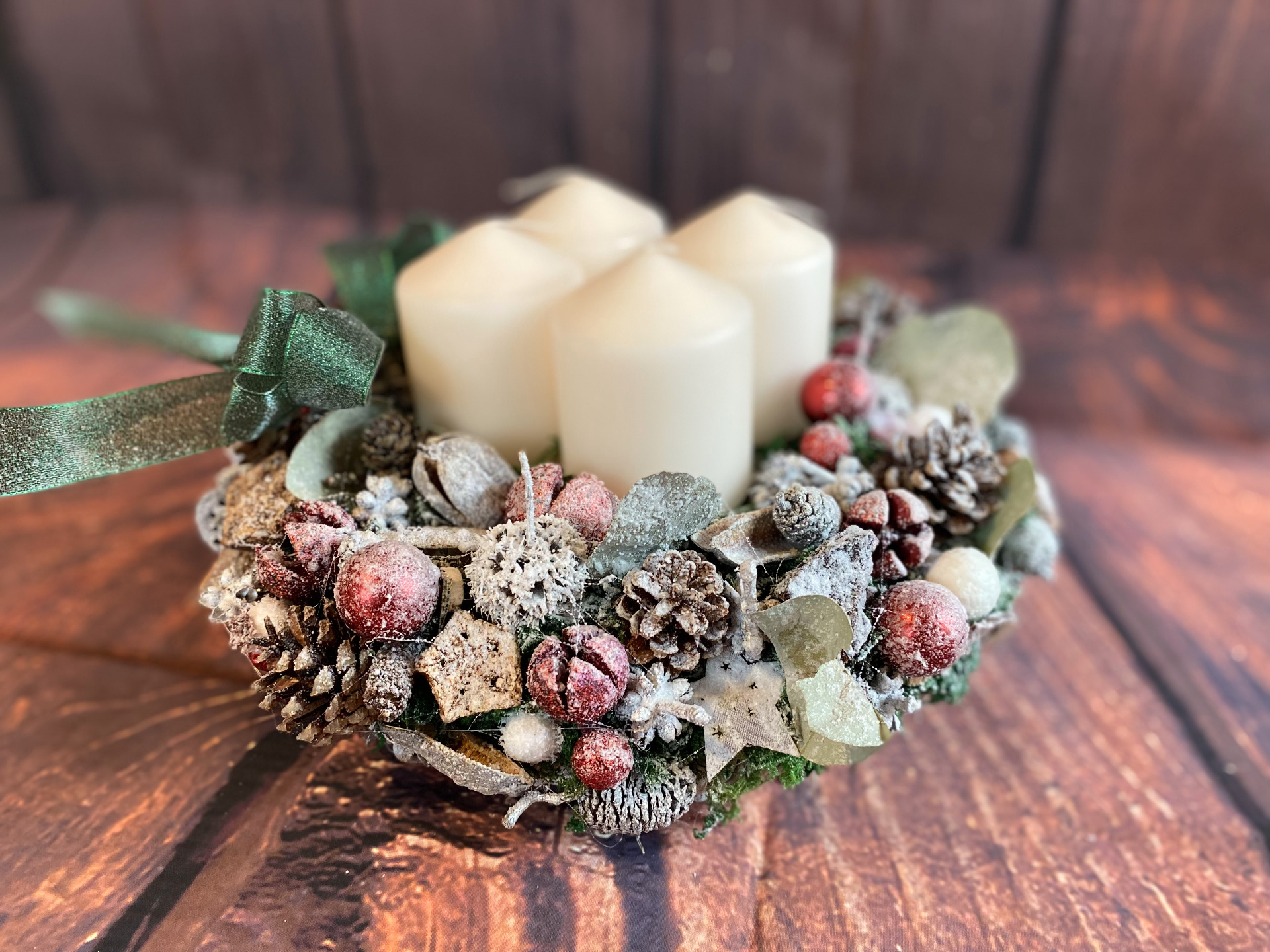 Menší rustikální věnec zdobený bíločervenou kombinací, průměr cca 25 cm.