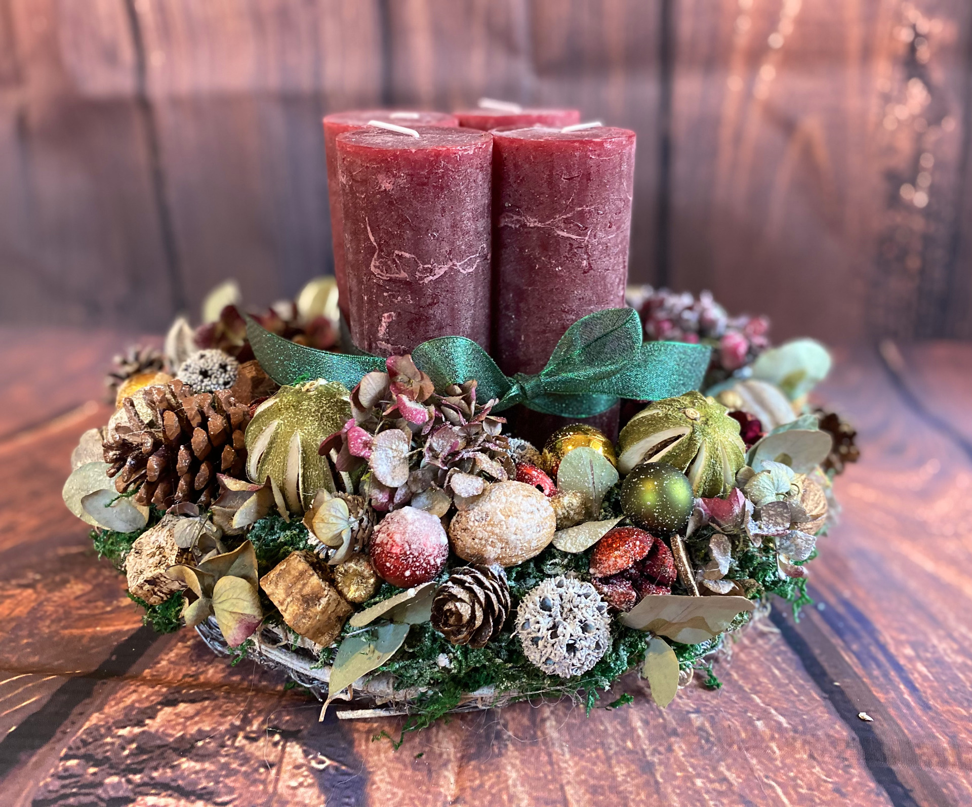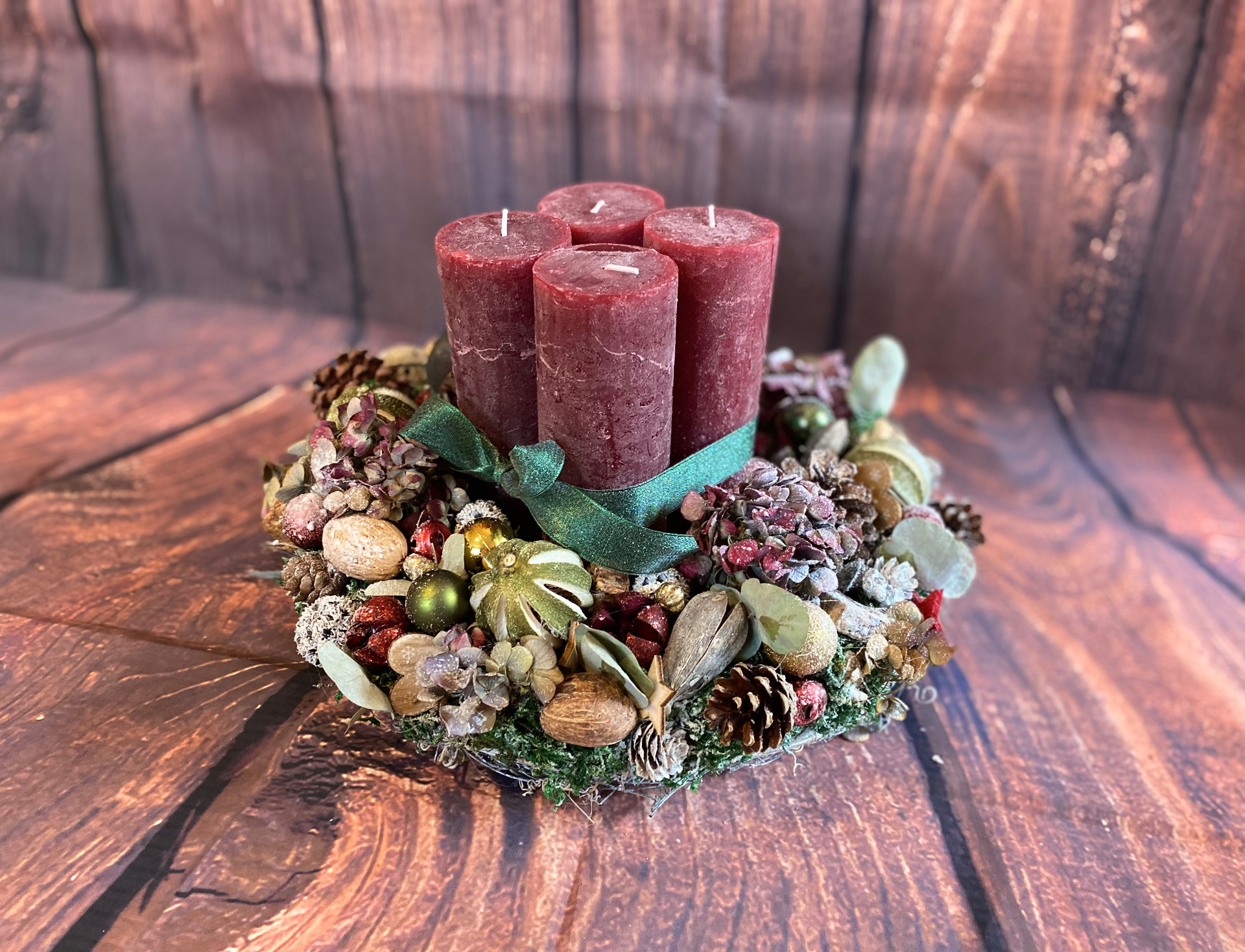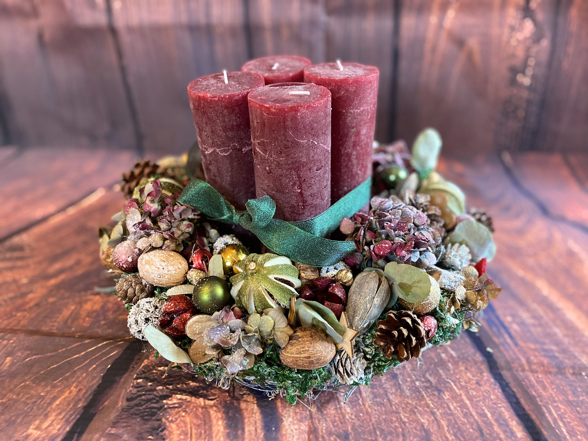Ruestikální adventí věnec z trvanlivého materiálu má průměr cca 38 cm, zdobený je baňkami, barvenou sušinou a hortenzií.