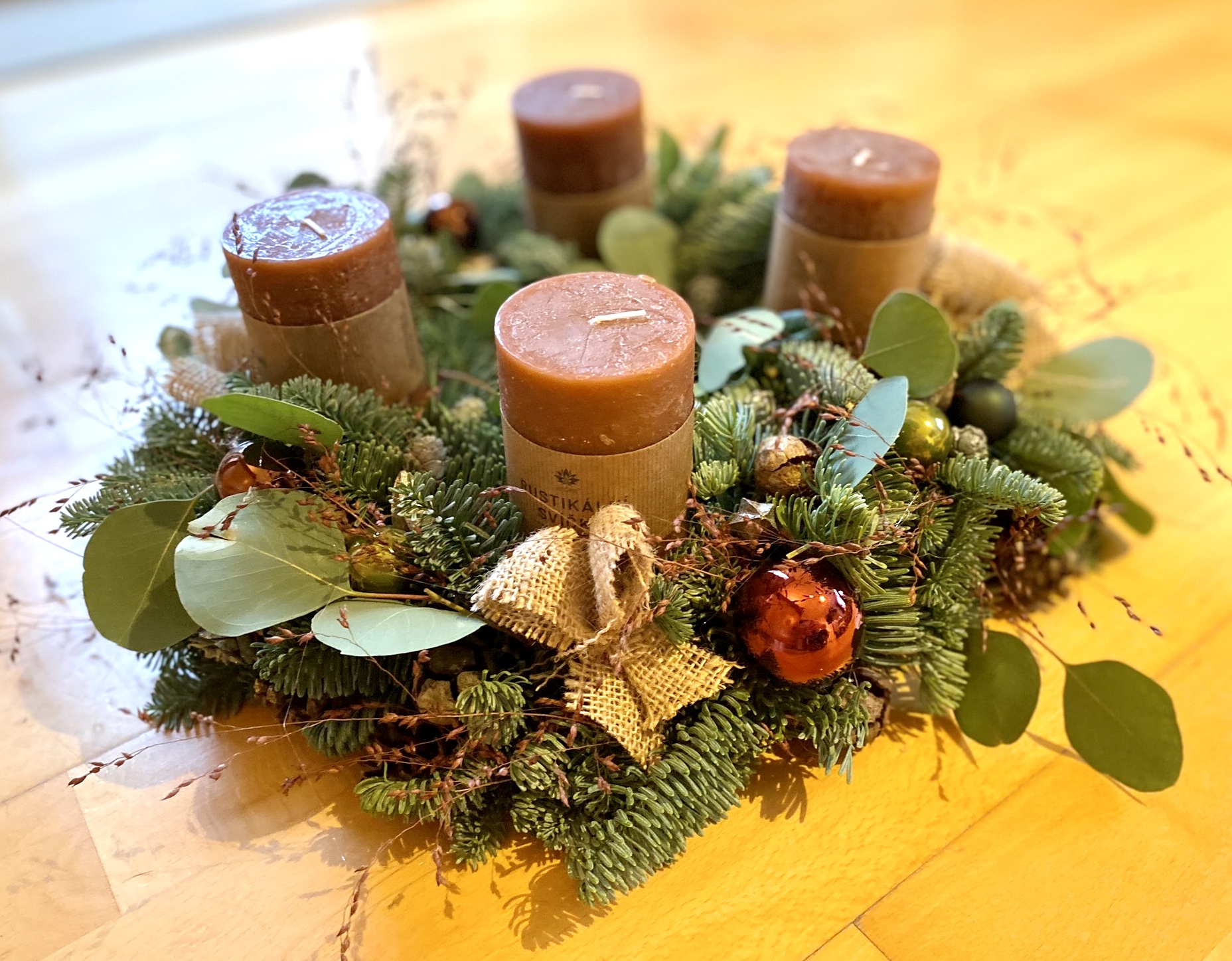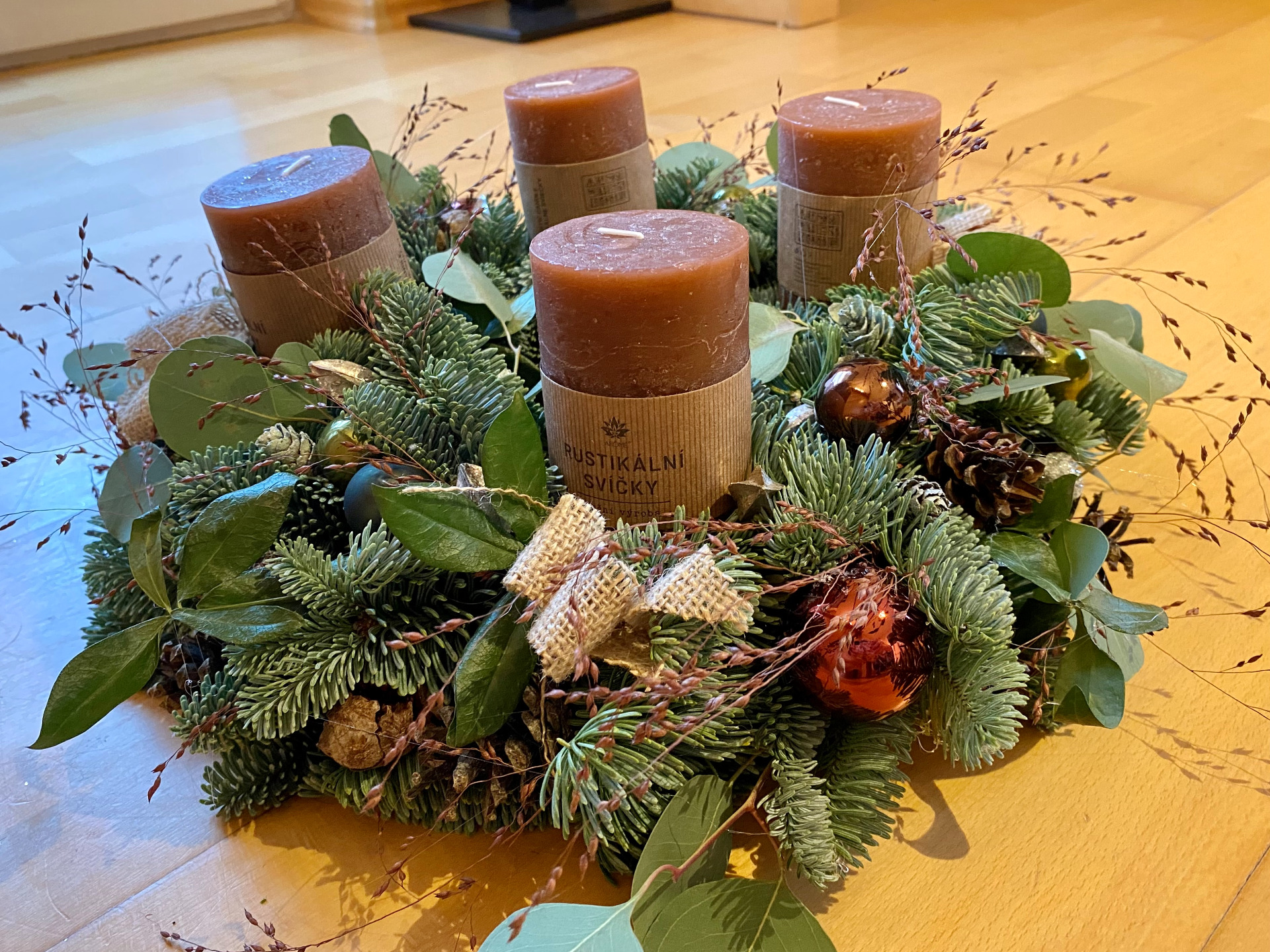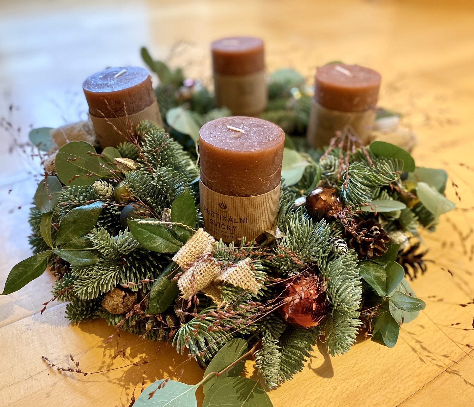 Adventní přírodní věnec z jedle Nobilis neopadá a je dozdobený oblíbeným eukalyptem a přízdobami ve stejném dekoru. Průměr cca 38 cm.