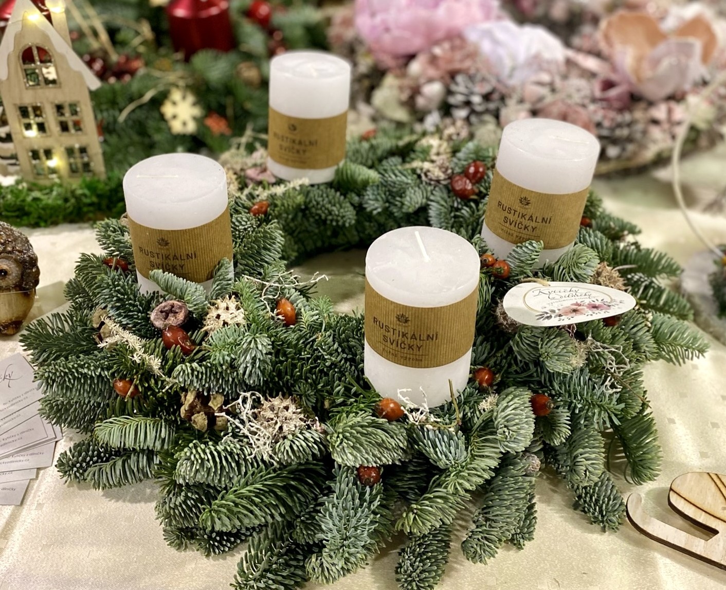 Rustikální adventní věnec je vázaný z jedle Nobilis a dekorovaný přírodním materiálem. Průměr věnce cca 40 cm.