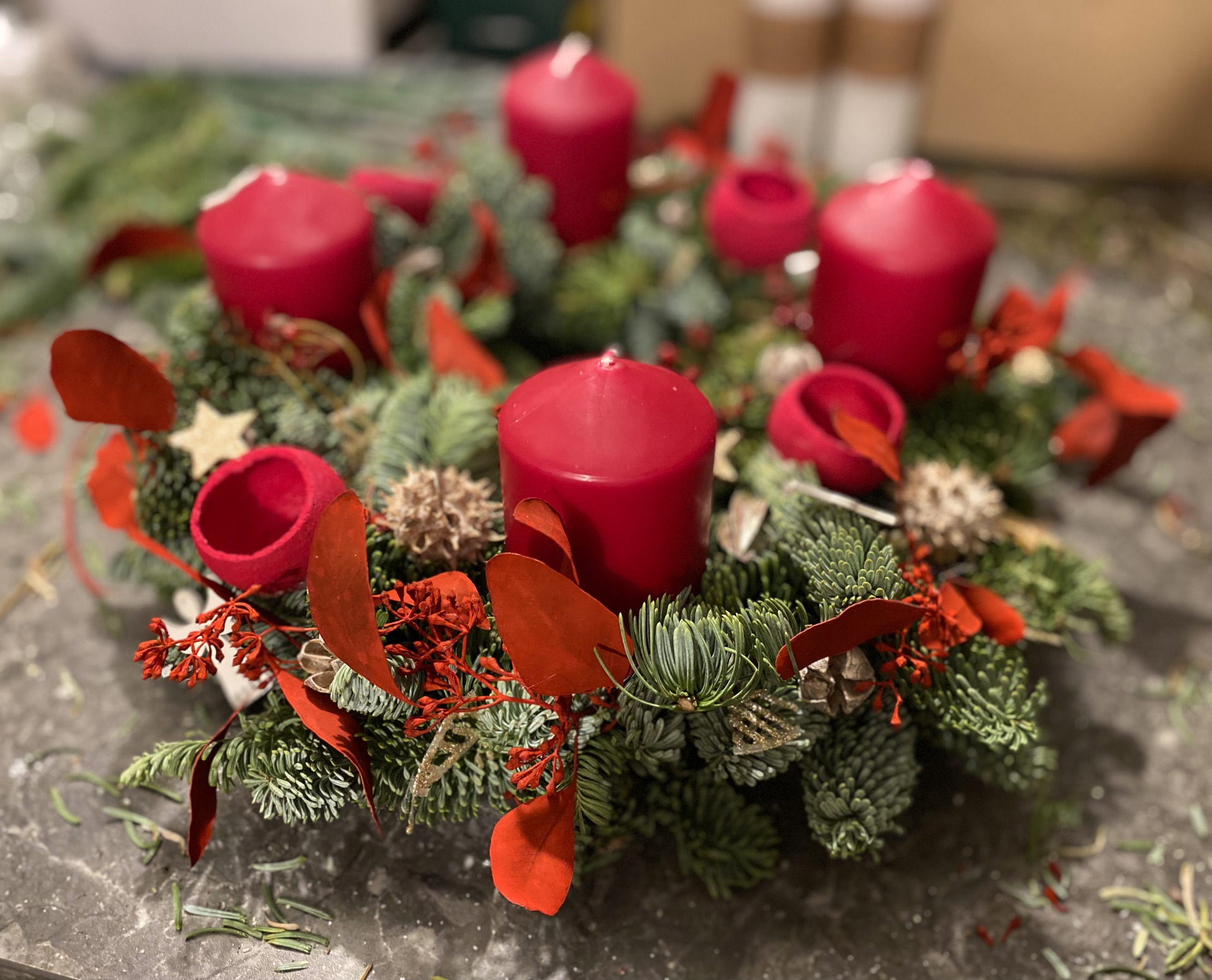 Přírodní adventní věnec z jedle Nobilis, která neopadá je zdobený červeným eukalyptem. Průměr cca 38 cm.