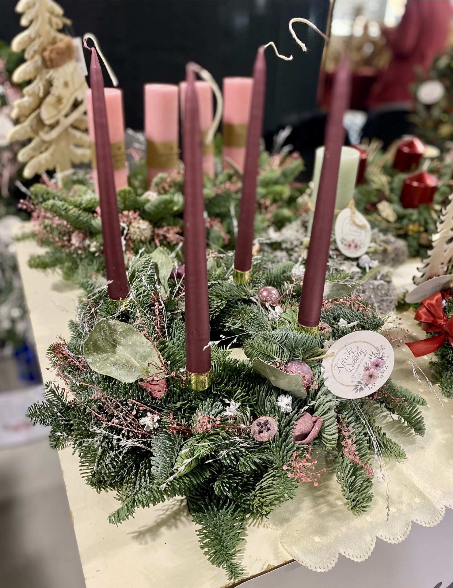 Elegantní adventní věnec vázaný z voňavé jedle Nobilis a eukalyptu má průměr 39 cm.