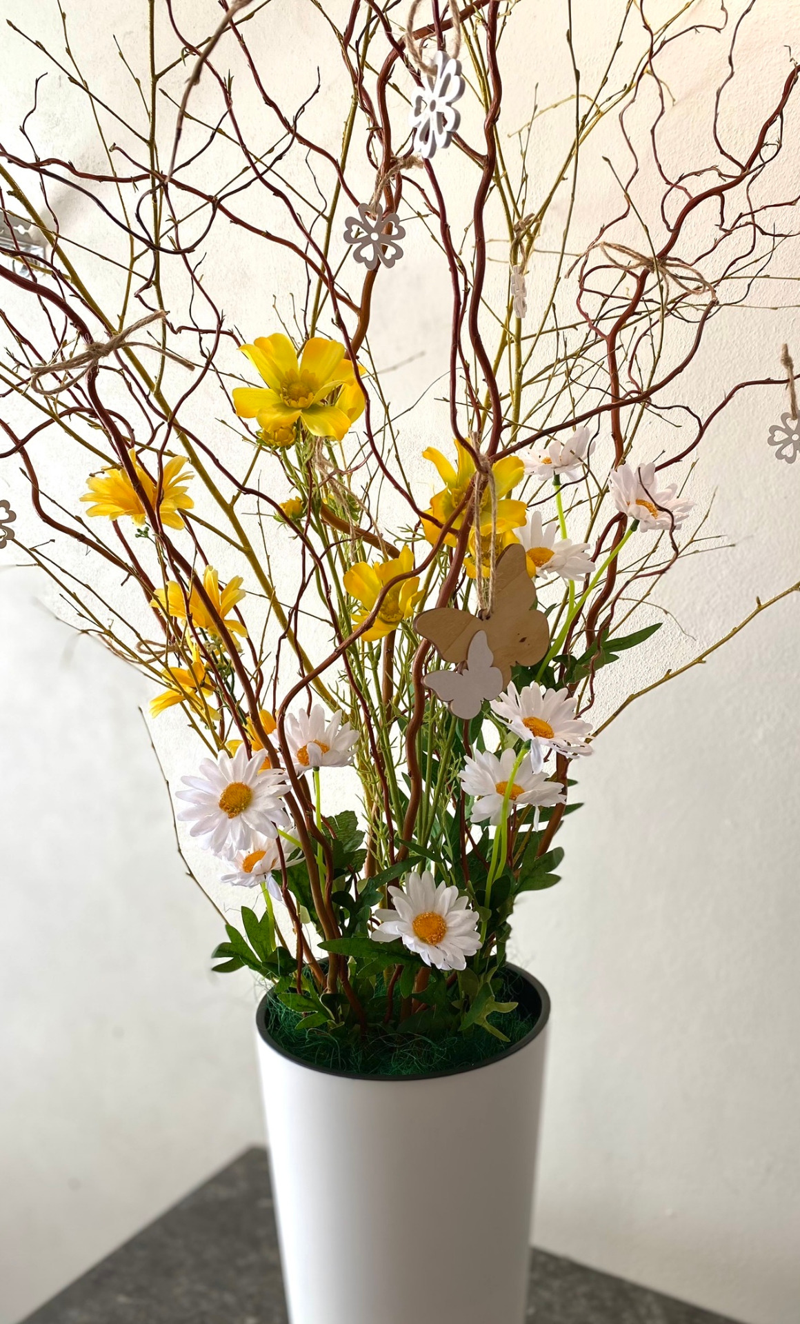Celoroční dekorace s kopretinami je vhodná do interiéru i ven, základem je kroucená vrba dozdobená látkovými květinami. Výška dekorace cca 1 metr.
