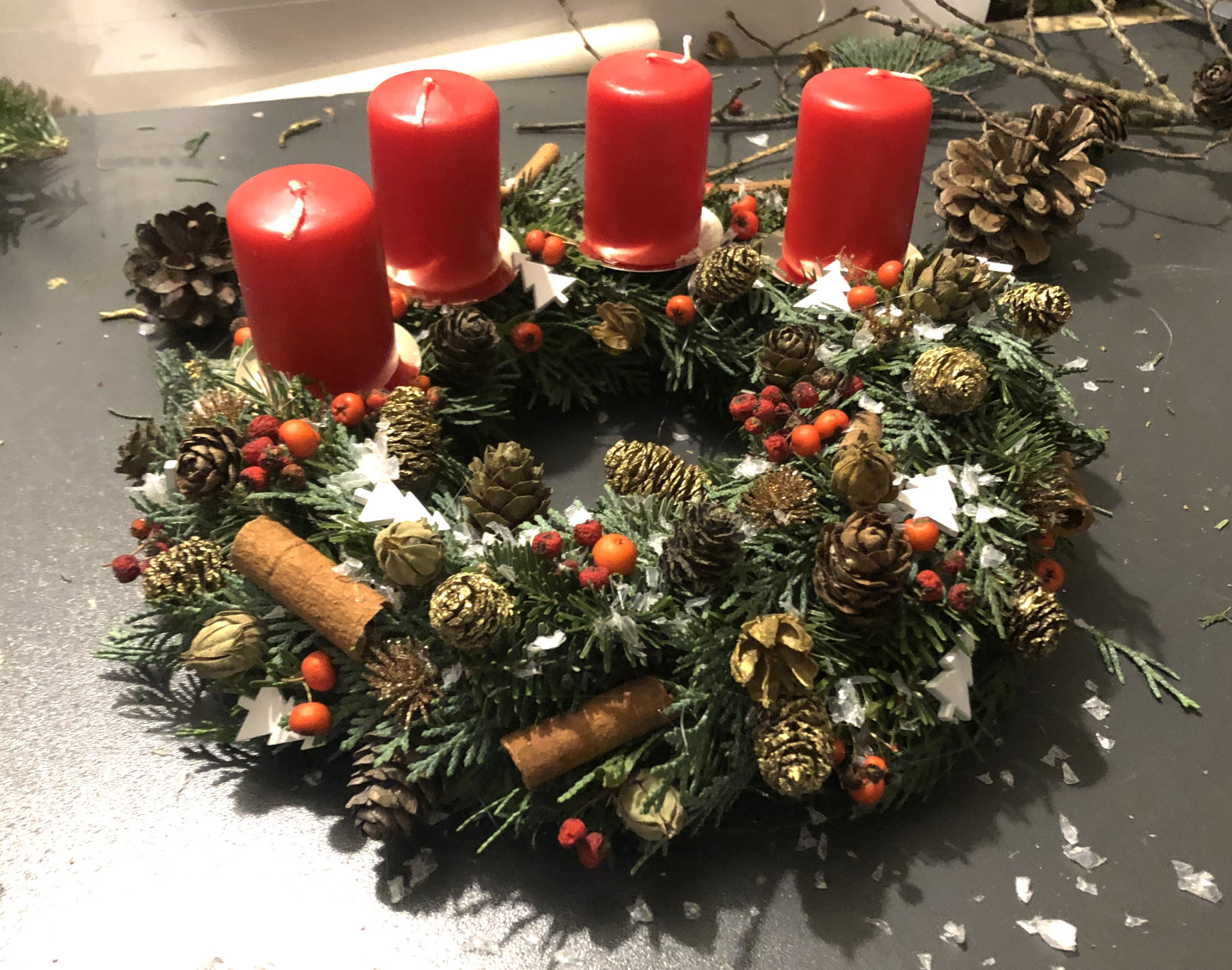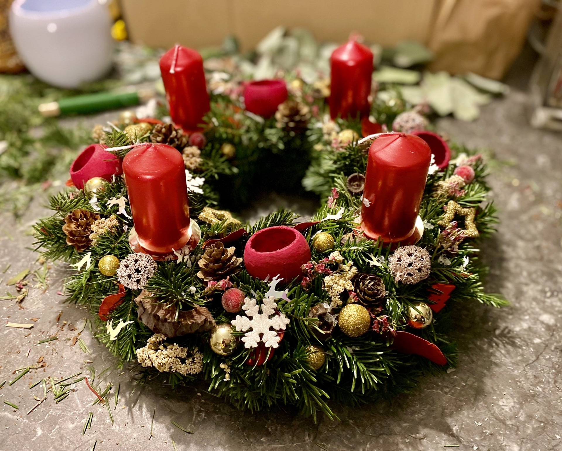 Voňavý advetní věnec je vypichovaný z přírodní jedle a dozdobený červenými, zlatými a bílými přízdobami. Svíčky lze použít i větší ( cena na dotaz ) nebo lze svíčky umístit vedle sebe. Průměr cca 37 cm.