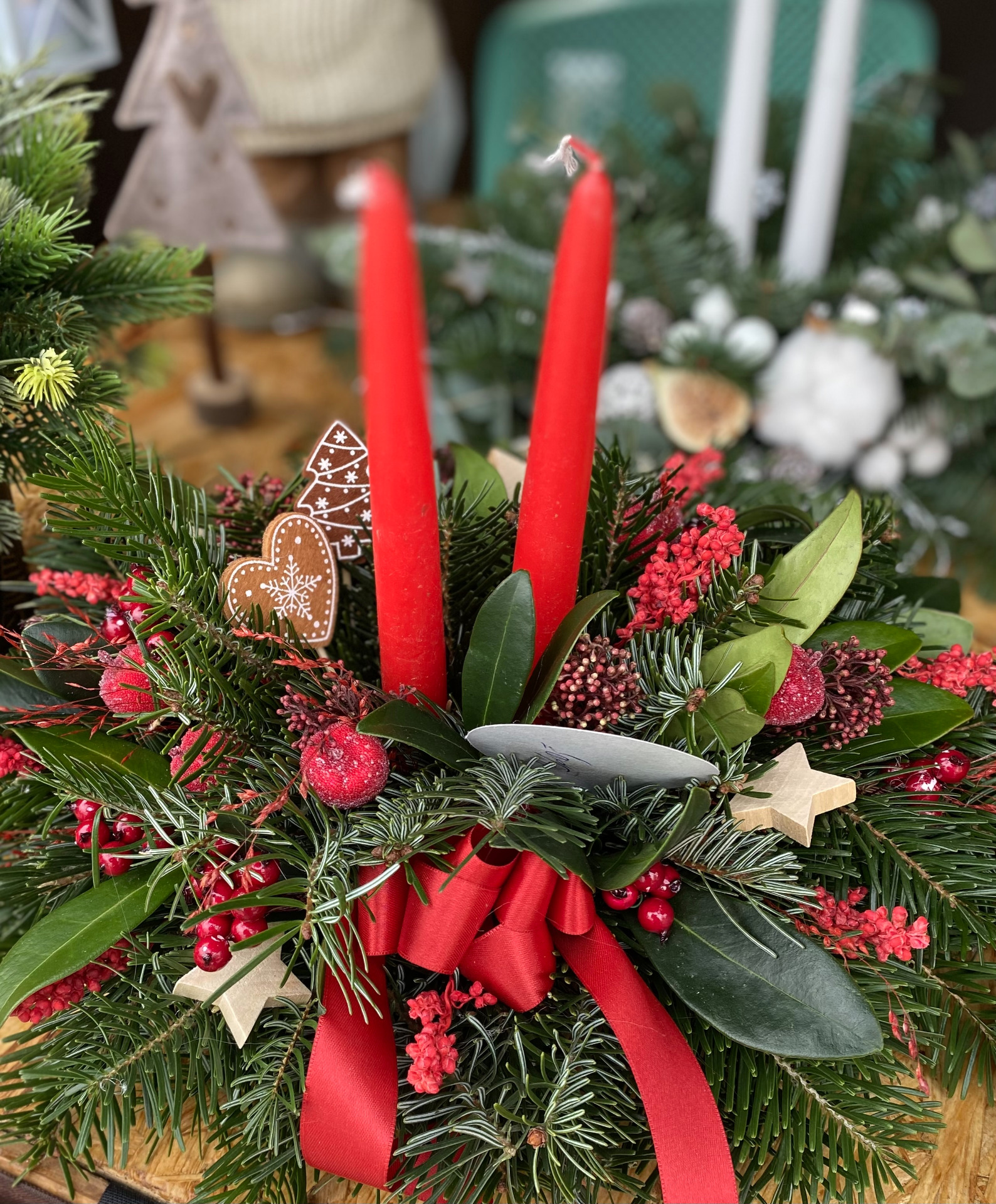 Svícínek je vypichovaný z přírodního chvojí a zdobený červenými přízdobami. Vhodný je na vánoční stůl. Průměr cca 20 cm.