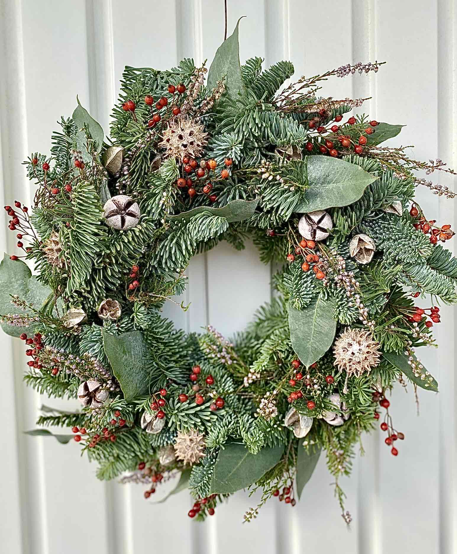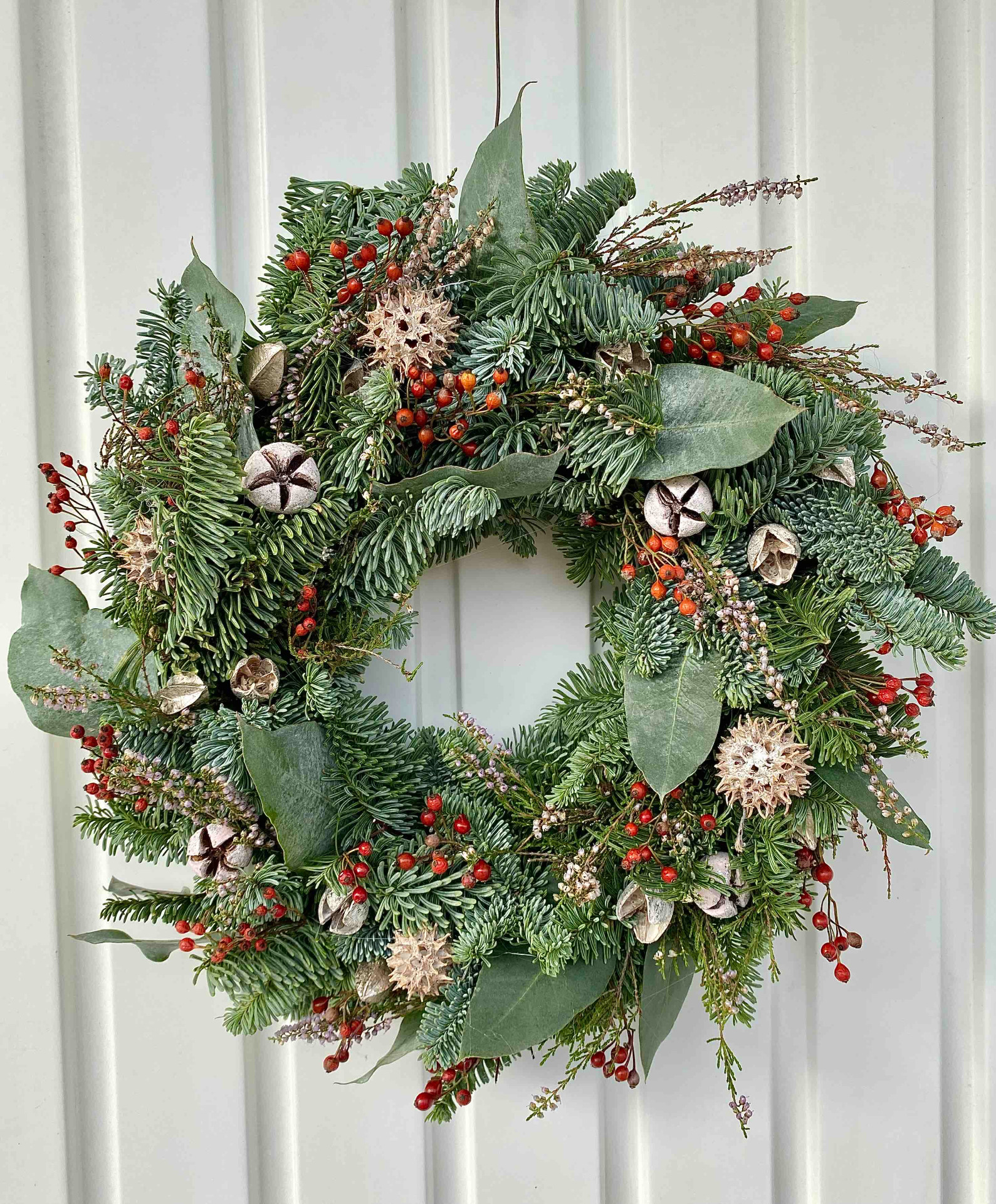 Přírodní věnec z jedle Nobilis, eukalyptu a barvené sušiny je jemně zdobený do růžovočervených odstínů. Průměr 40 cm.