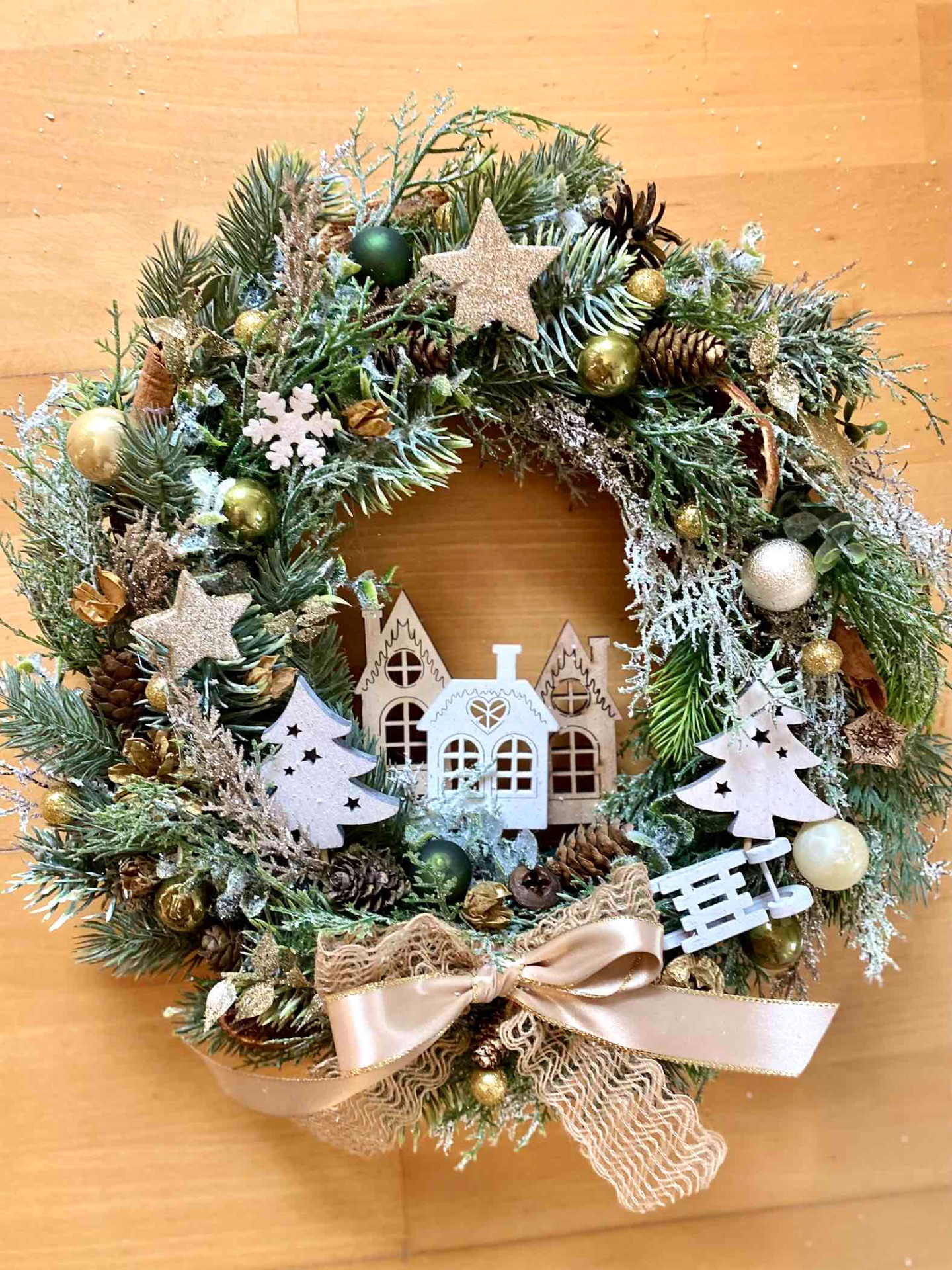 Bohatě zdobený zlatavobílý vánoční věnec je zdobený domečky a mnoha tématickými přízdobami. Věnec lze dozdobit světýlky ( napsat do poznámky, příplatek 100 Kč ). Průměr věnce 40 cm.