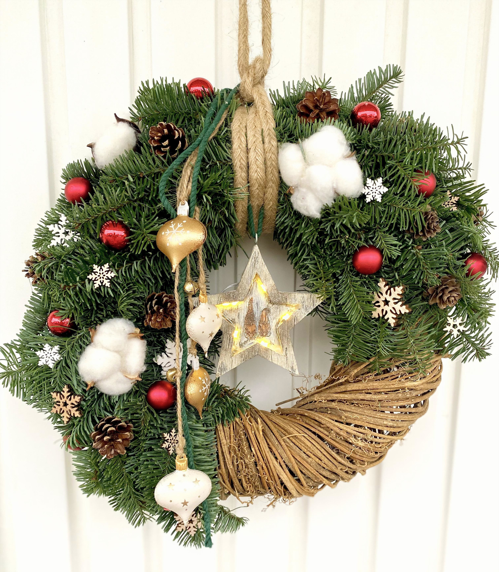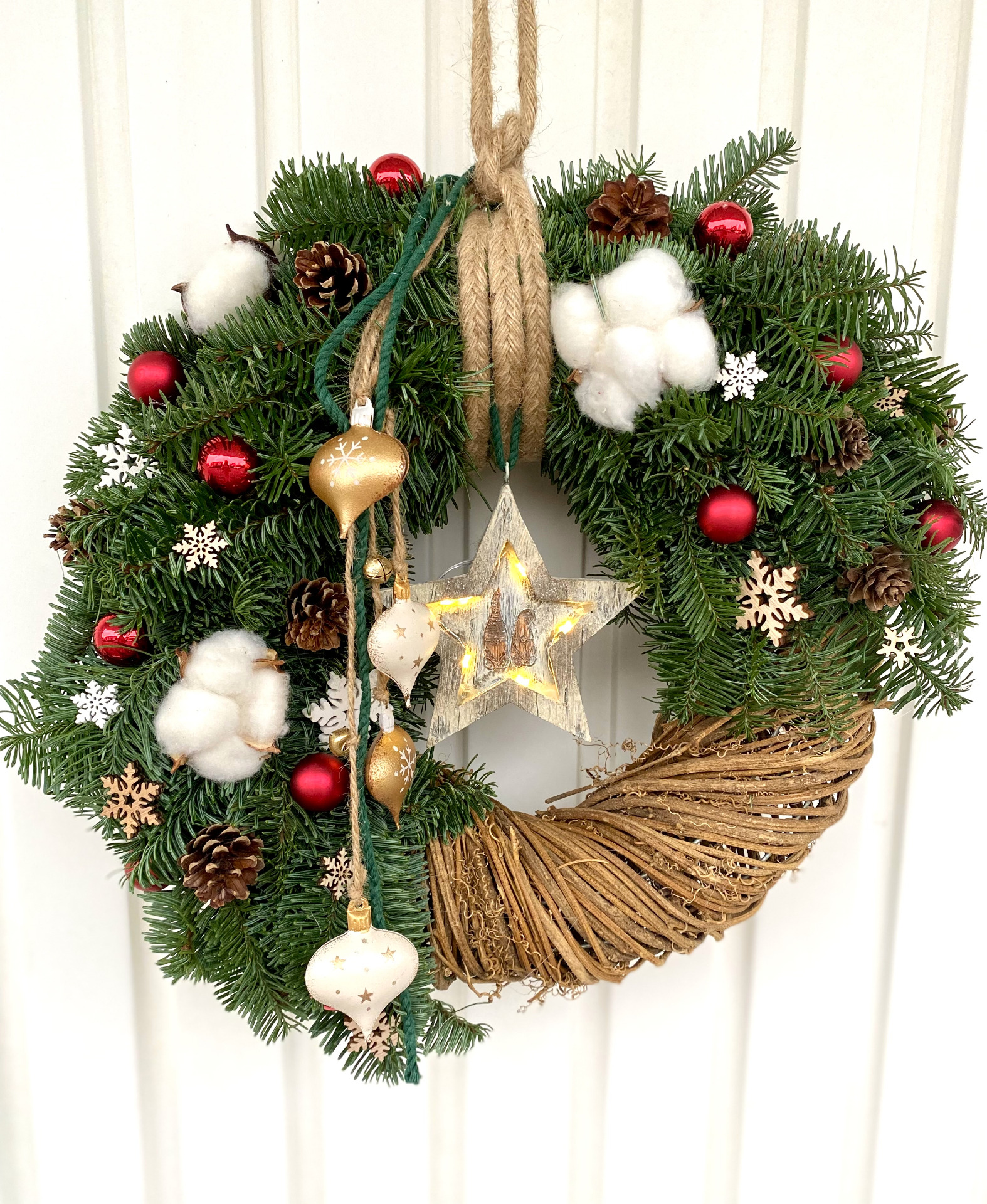 Tento neobvyklý vánoční věnec je výrazný nejen díky svítící hvězdě, ale i výraznému vázání. Vyrobený je z přírodního materiálu ale lze i z umělého ( zadejte do poznámky ). Průměr cca 38-40 cm.