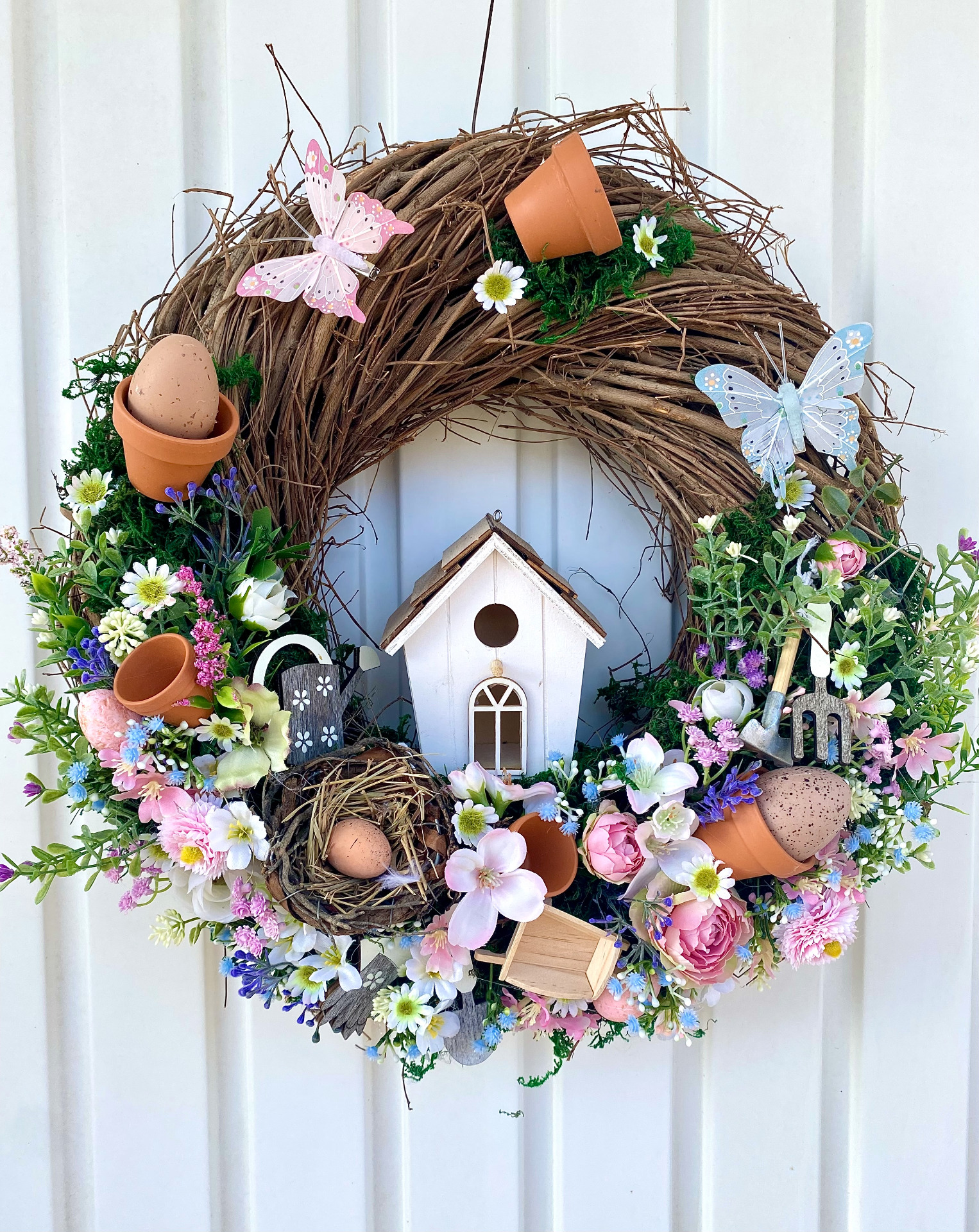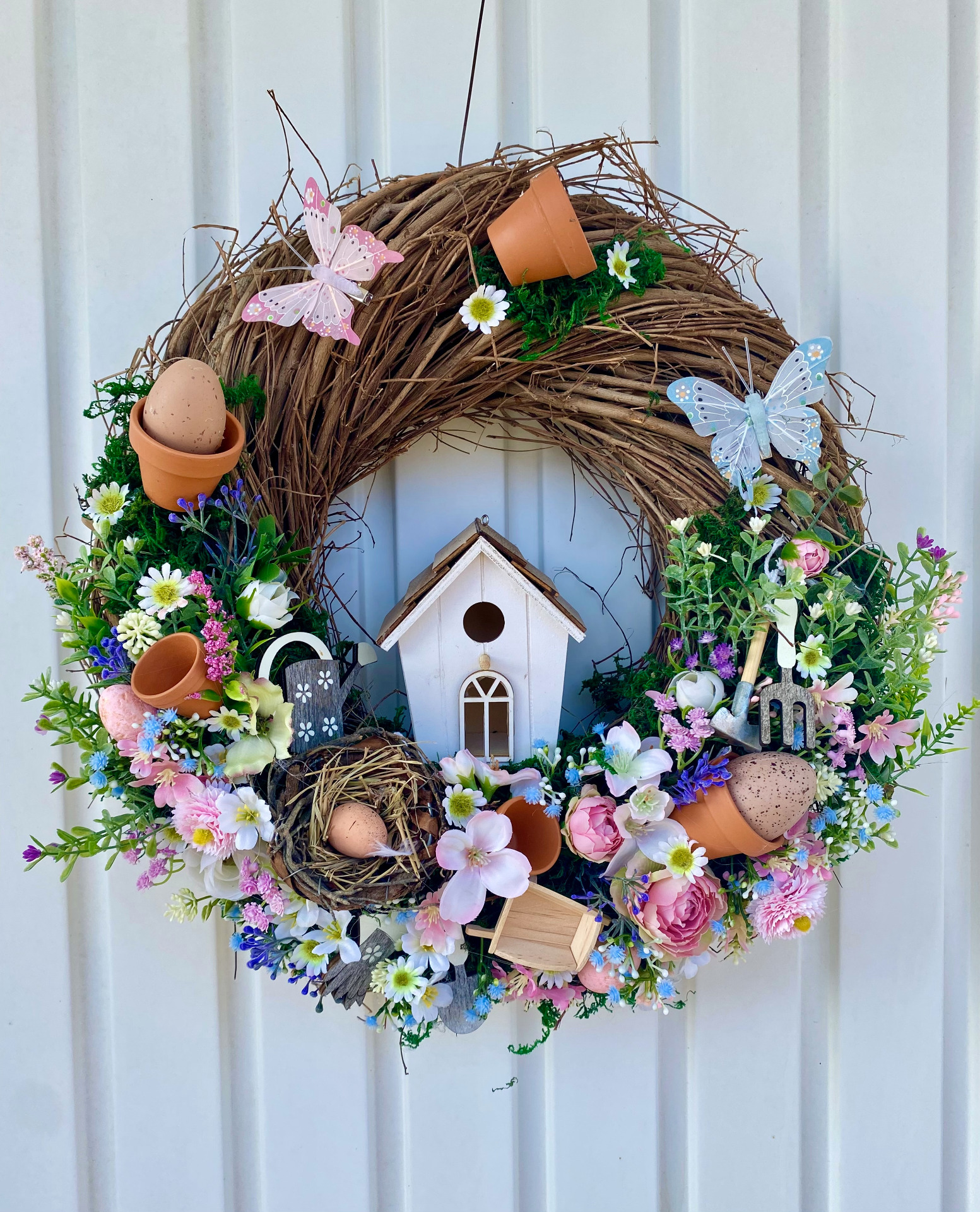 Hravý jarní věneček jev plný nejen květů ale hlavně miniatur zahradního nářadí, najdete na něm květináčky, konvičku, kolečko, hrabičky a v neposlední řadě hnízdo s vajíčky a domeček. Určitě potěší nejen děti :). Věnec je větší, průměr 40 cm.